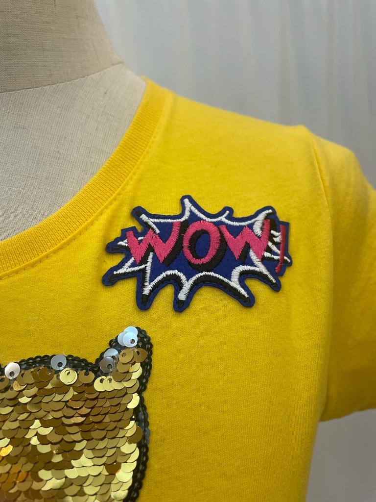 Unique local designer yellow pure cotton t shirt with flipping two colors sequins and wow patch