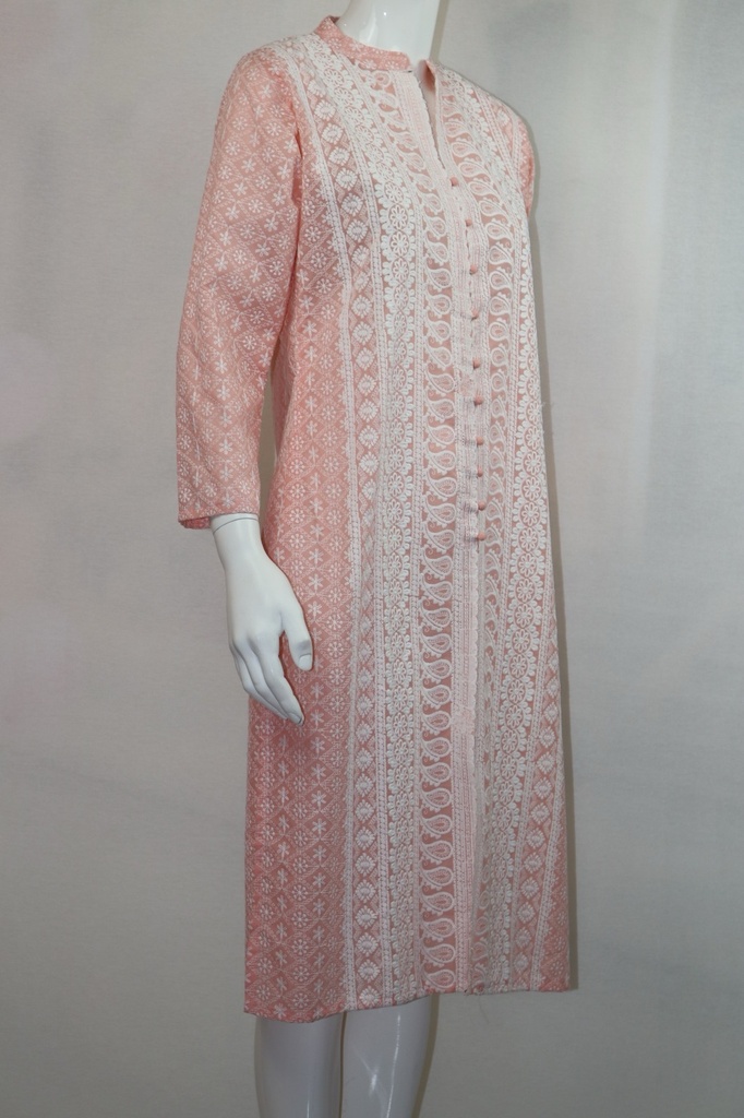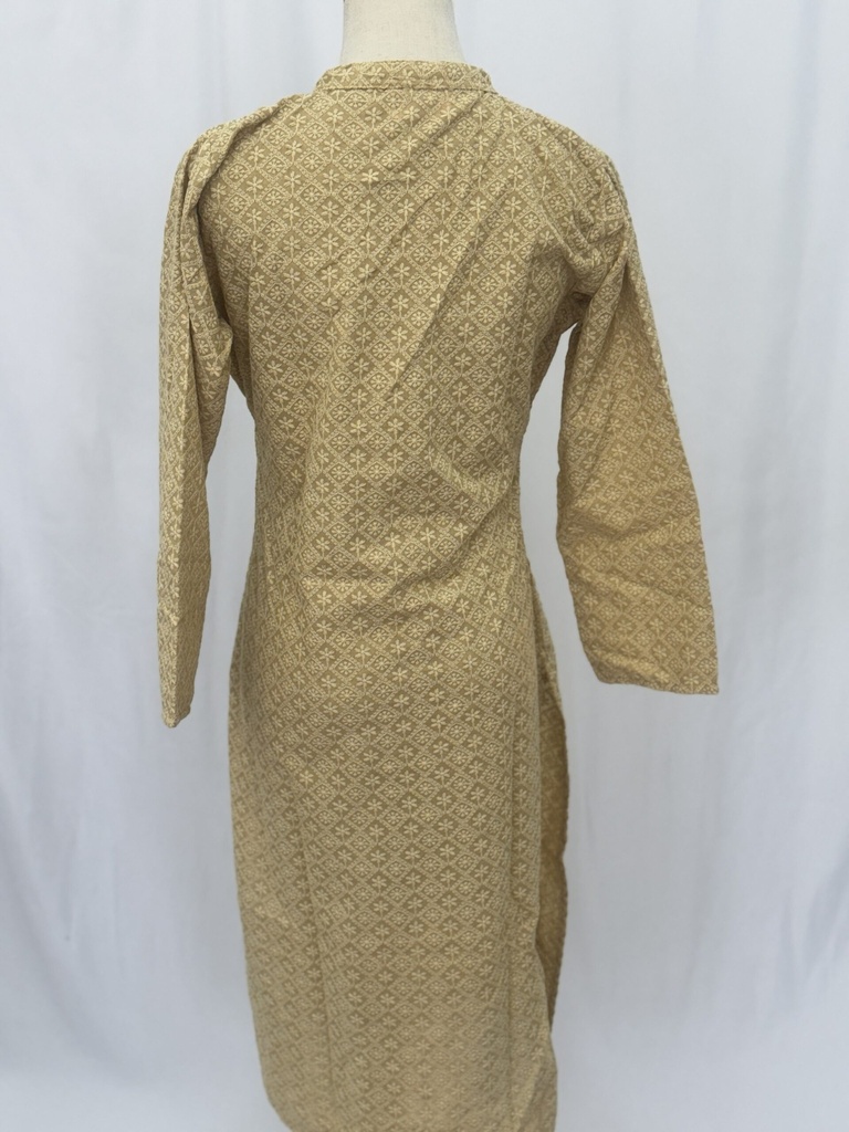 Benjabi style Floral print lace detailing mid length dress with long slit on the sides and long sleeves. Pure cotton with delicate lace along the front